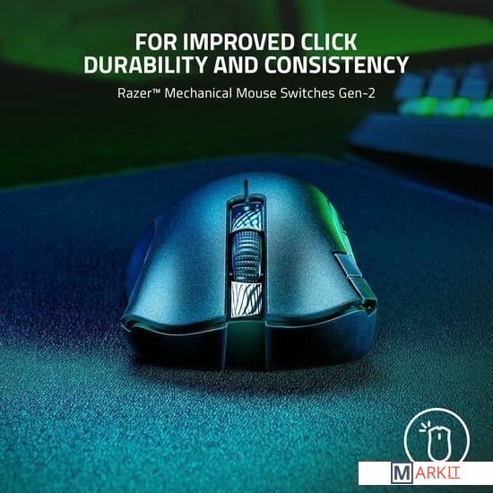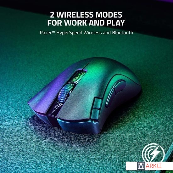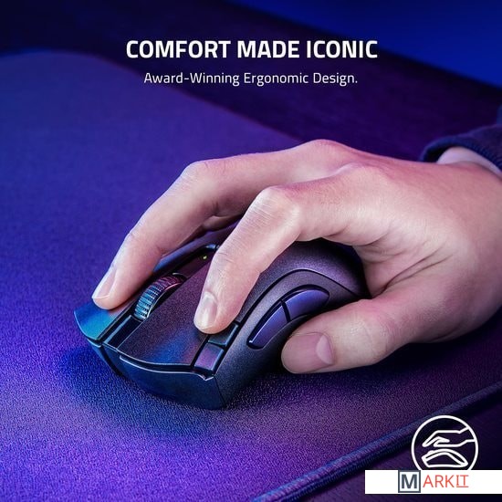 Технология высокоскоростной беспроводной связи Razer HyperSpeed Wireless позволит вам раскрыть свои истинные возможности благодаря беспроводному подключению со сверхнизкой задержкой.Способна работать от одной батареи AA (входит в комплект мыши) или AAA, гибридный слот мыши для батареи позволяет увеличить время автономной работы или уменьшить вес — и все это оптимально расположено для идеального баланса мышки.Независимо от того, настраиваете ли вы основные команды или создаете самые продвинутые макросы, все необходимое управление будет у вас под рукой благодаря 2 уникальным кнопкам быстрого доступа на кромке и 2 боковым кнопкам.Будьте готовы к игре в любом месте с настроенными биндами на кнопках, макросами и удвоенным назначением кнопок с помощью функции Razer Hypershift.Эта беспроводная эргономичная игровая мышь плавно скользит по любой поверхности благодаря ножкам, сделанным из чистейшего высококачественного фторопласта.Время работы от батарейки: до 235 часов (2,4 ГГц), 615 часов (Bluetooth LE) от алкалиновой AA батарейкиВремя работы от батарейки: до 144 часов (2,4 ГГц), 369 часов (Bluetooth LE) от алкалиновой AАA батарейки